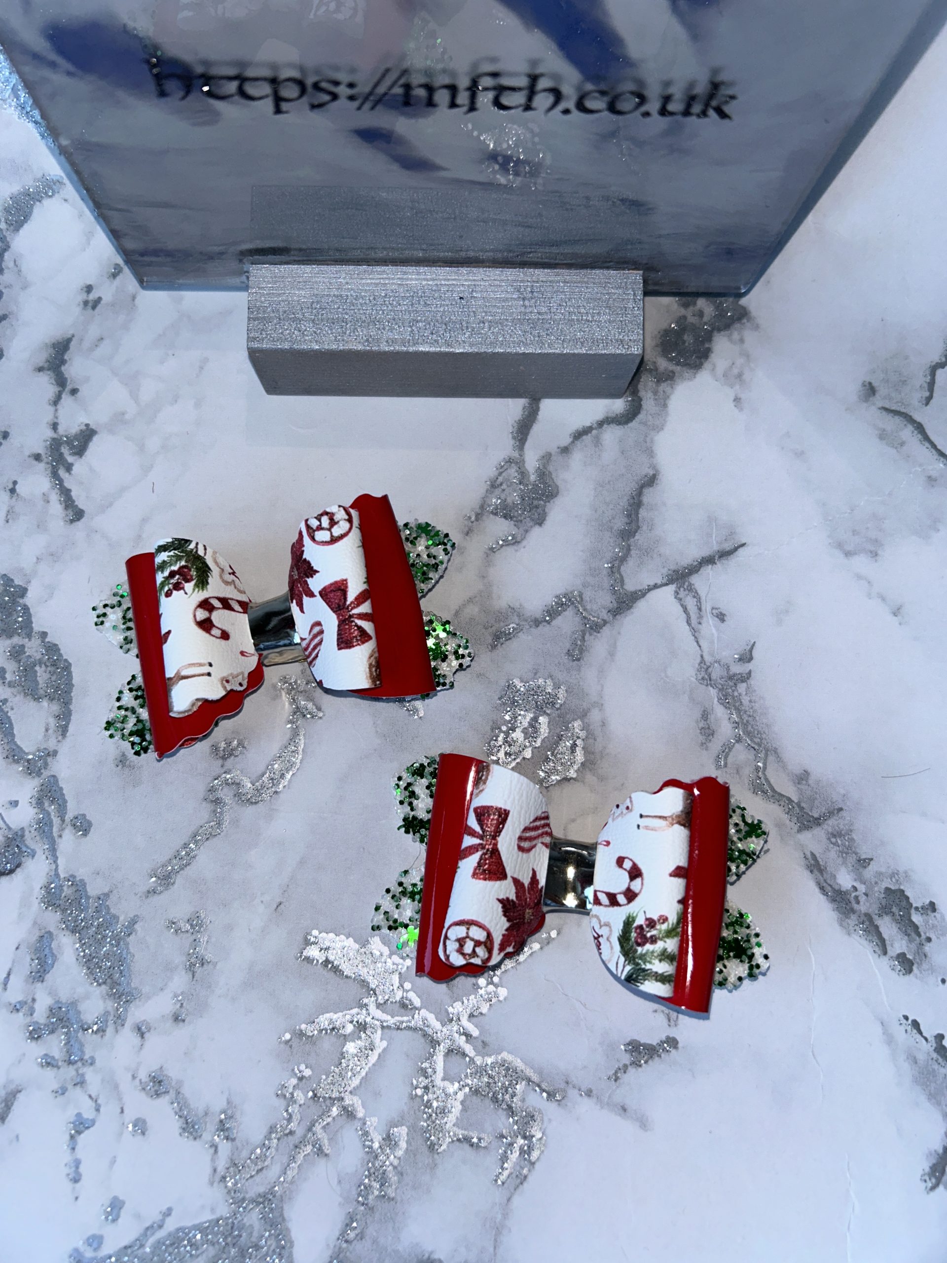 These 3 layered small bows feature a white and green glitter backing, with a patent red center and a Christmas themed top layer with candy canes, hot chocolate, little deer and more on the print. Finished off with the elegant mirror gold middle and alligator clasp fasteners these adorable bows are sold in sets of 2.