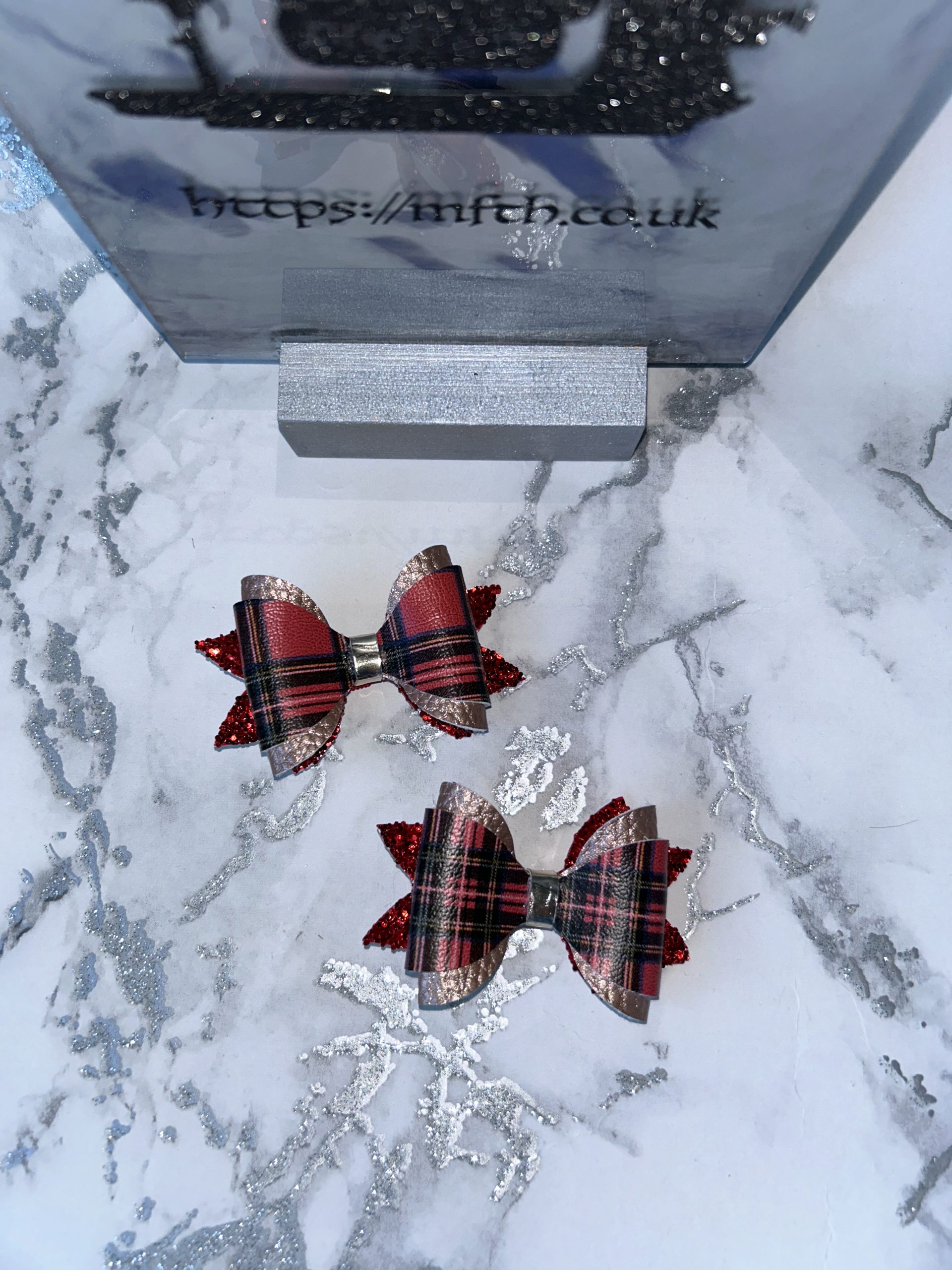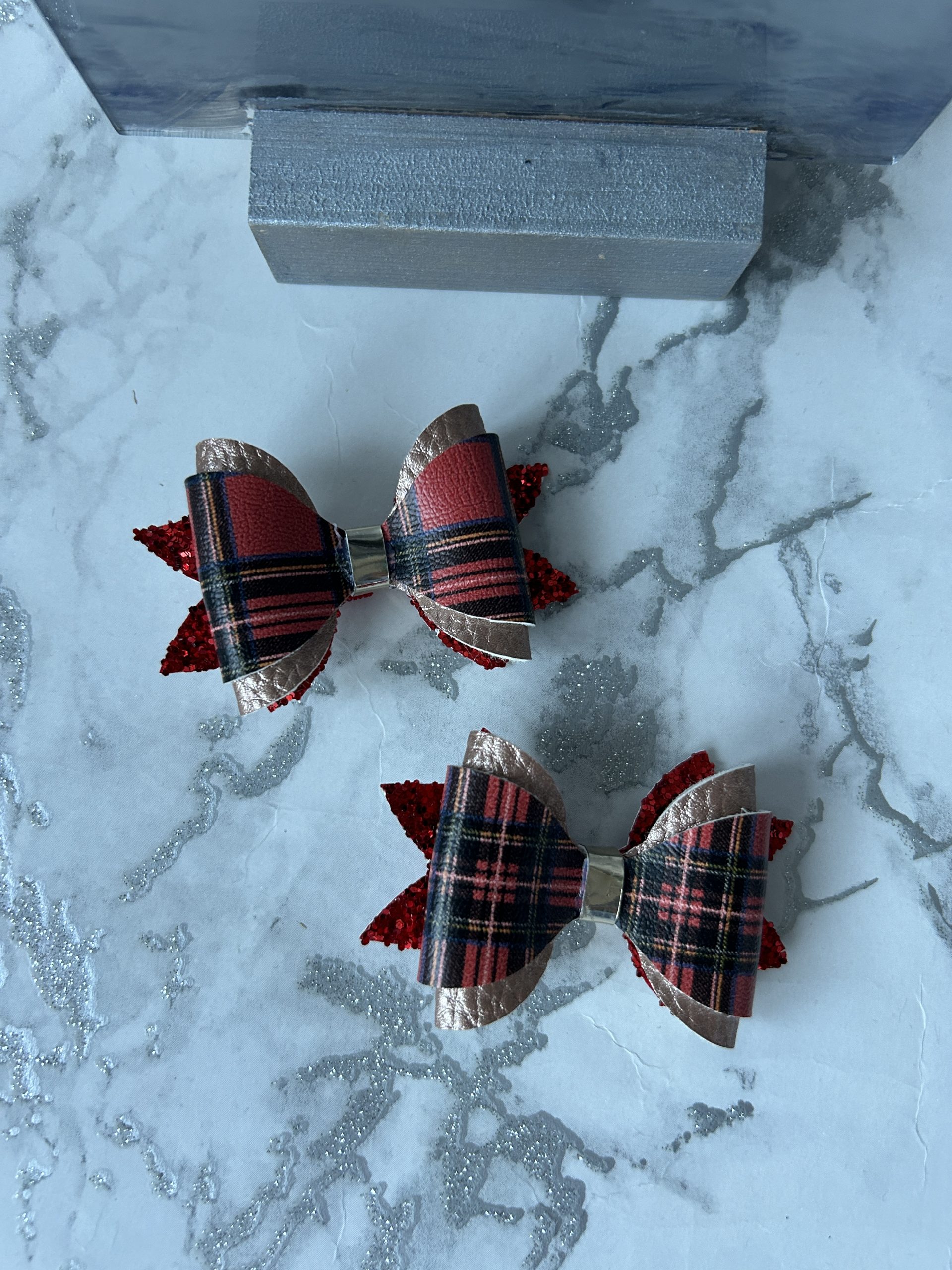 3 layer small bows with red glitter backing, rose gold middle and red tartan overlay on alligator clips.